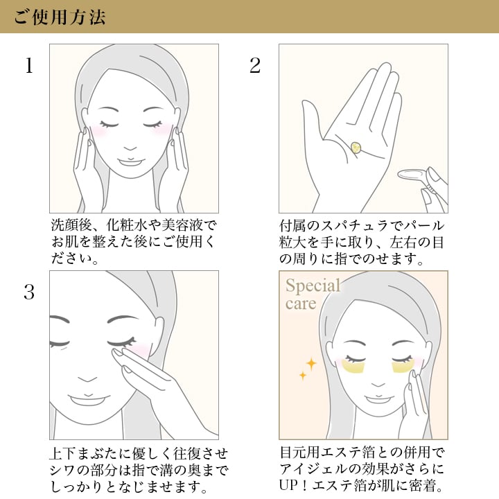 這款來自日本的眼部精華,蘊含高濃度金箔,質地清爽柔滑,配合美肌成分 Syn-ake(類似肉毒桿菌的成分),專為改善眼周細紋、乾燥、鬆弛等老化問題而設,令雙眼重拾神采✨。 🌿 奢華成分全面呵護眼周肌膚 金箔 + Syn-ake:強效支撐眼周肌膚,抗皺緊緻 水解秋葵籽萃取物、絞股藍葉萃取物:快速滲透角質層,提升彈性與水潤感 山茶籽油(保濕)、藻黃素(肌膚調理)、角叉菜萃取:改善膚質,補水鎖水,令肌膚更柔嫩 💡 適合任何年齡層使用,特別推薦給眼周乾燥、細紋明顯人士! ISO9001 認證金箔製造,品質安全有保證! 🧴 使用方法簡單方便 1️⃣ 潔面後,使用化妝水及精華液爽膚 2️⃣ 用附送小匙取珍珠大小份量,塗抹於左右眼周 3️⃣ 輕輕滑動於上下眼瞼,重點塗抹於皺紋位置 📦 產品資料 尺寸:W65 × D65 × H40mm 內容量:30g 重量:95g 產地:日本 🇯🇵
