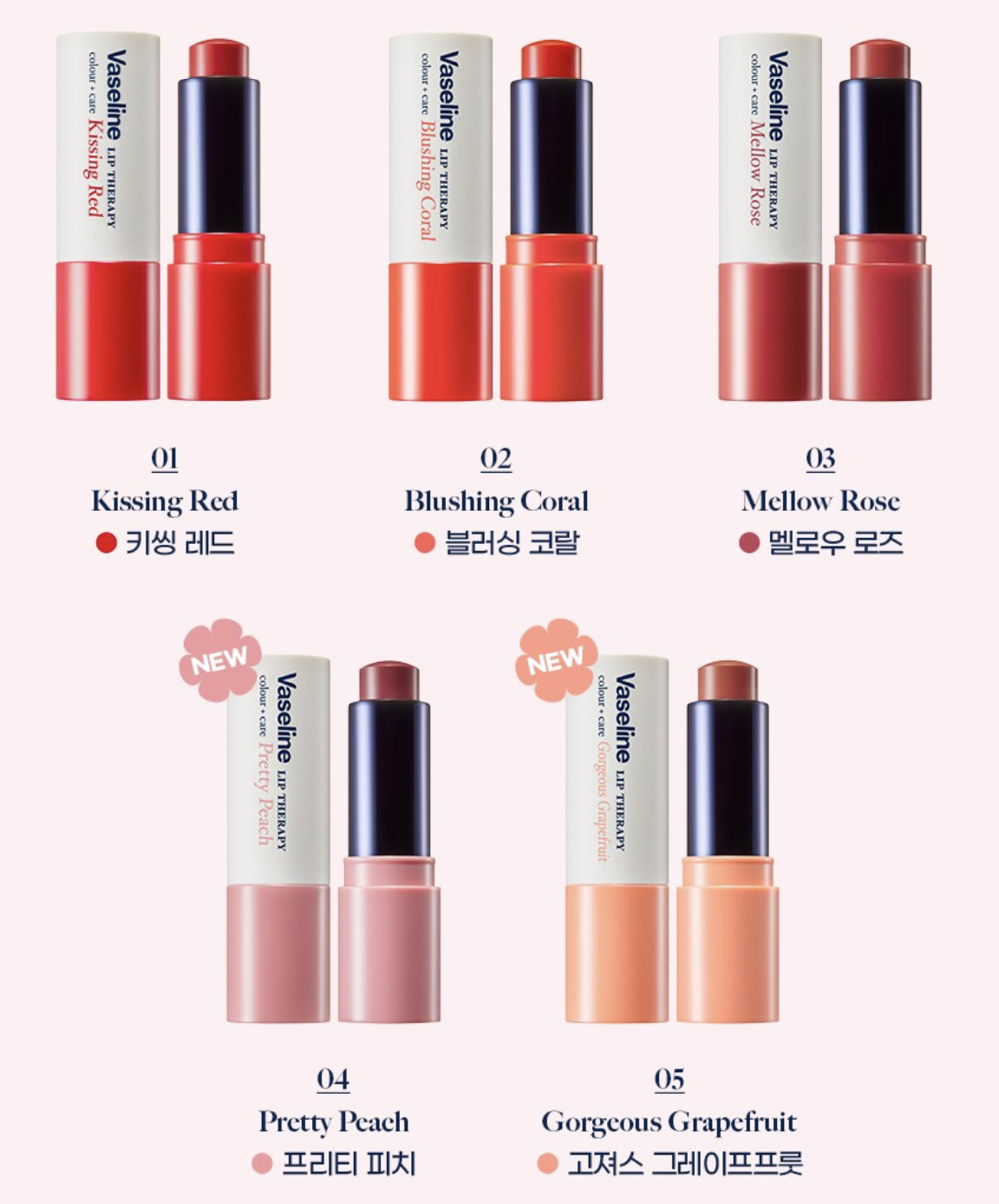 一抹顯色、滋潤、好氣色💋💄✨ 護唇+潤色二合一,雙唇即刻水潤顯色,自然美唇一支搞定!✨ 💧經典凡士林修護💧 專利微凝晶凍,高效鎖住水分,深層滋養乾燥雙唇,持續修護改善唇紋,告別甩皮爆拆 💋自然顯色 好氣色💋 顯色度適中,能自然提亮唇色,打造偽素顏好氣色,素顏出街都無壓力 🌈5款亞洲專屬色號🌈 專為亞洲膚色調配嘅五款人氣色號,總有一款啱你心水 01 Kissing Red ❤️ 經典紅潤,瞬間提升氣色,打造自信女神感 02 Blushing Coral 🪸清新珊瑚色,甜美活力,日常百搭不挑膚色 03 Mellow Rose 🌹 柔美玫瑰粉,溫柔浪漫,展現少女感 04 Pretty Peach🍑✨ 淡雅蜜桃色,自然清新,素顏也能輕鬆駕馭 05 Gorgeous Grapefruit 🍊 亮麗西柚色,活潑俏皮,讓笑容更有魅力 細細支方便放入手袋或褲袋🩳 隨時隨地補搽,保持雙唇最佳狀態🧚🏻‍♀️ 而且配方溫和🌿 通過皮膚測試,敏感肌都啱用 一支潤唇膏,搞掂護唇、顯色、方便嘅煩惱!讓你隨時保持最佳狀態!🛒💕 規格:4.2g / 支 產地:韓國