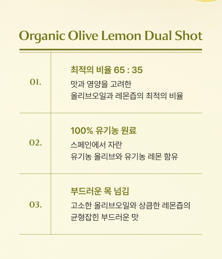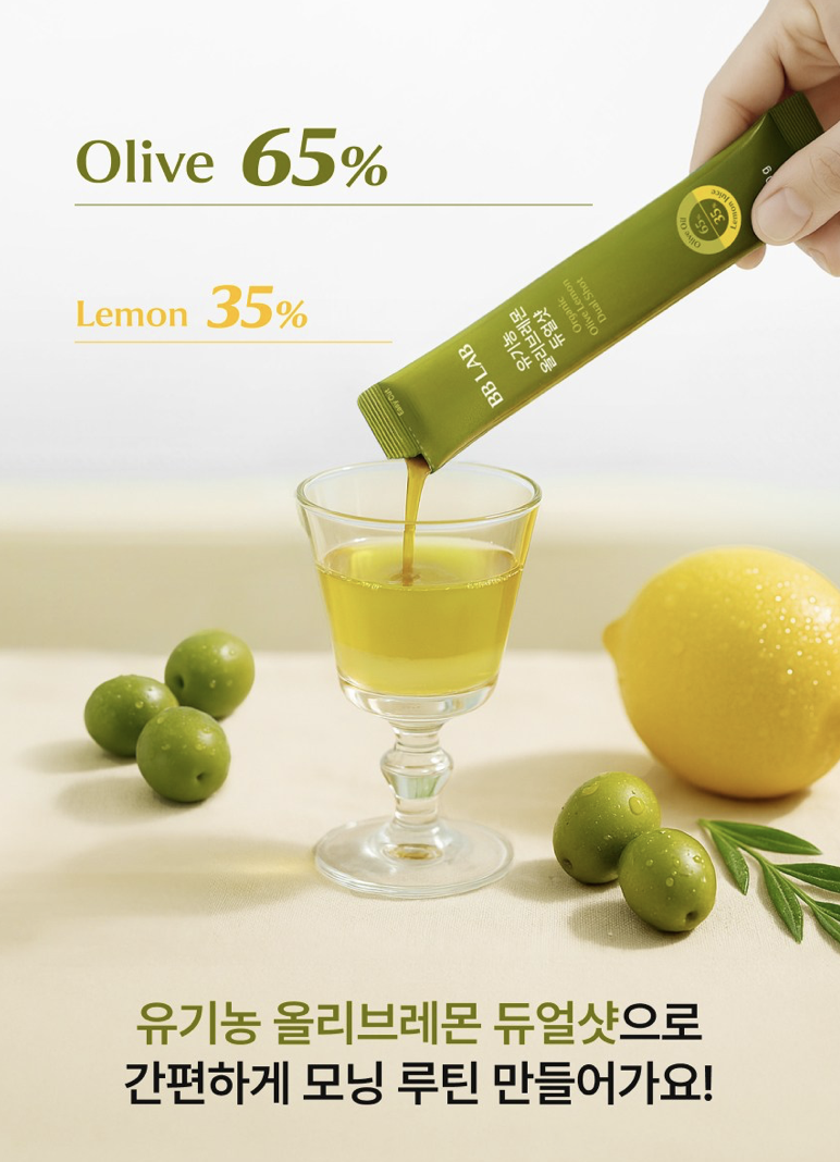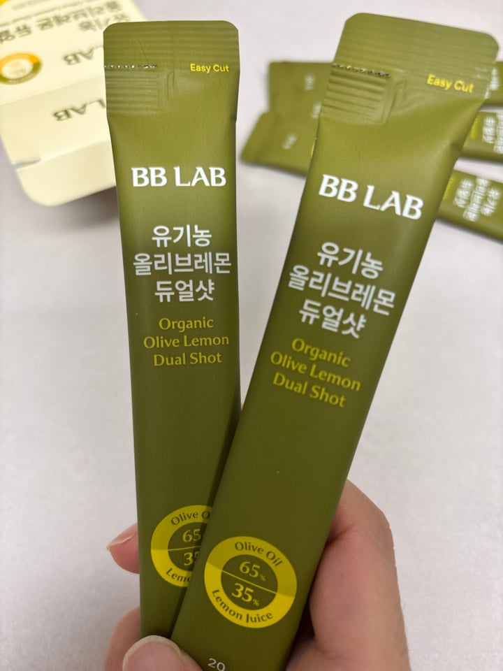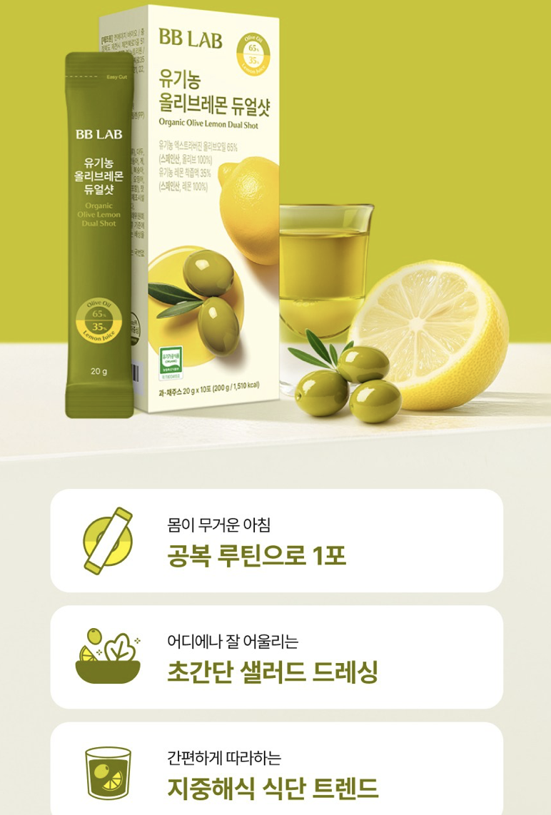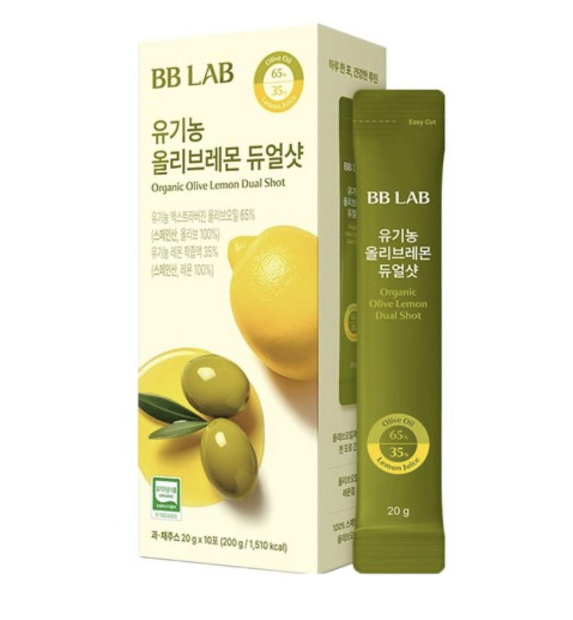 🍋✨【BB Lab 有機橄欖檸檬雙效飲品|健康新選擇】💚 每天的健康管理,從一杯開始🥛 全新 有機橄欖檸檬雙效飲品,結合天然橄欖油與檸檬精華,為身體注入滿滿活力,幫助消化、促進代謝,讓你由內而外散發健康光采~🌿 ✳️ 100% 有機認證成分 採用來自西班牙安達盧西亞 (Andalusia) 的頂級初榨橄欖油,搭配 NFC(非濃縮還原)有機檸檬汁,提供最純淨、潔淨的營養 🍃 有機橄欖油:富含天然抗氧化成分,幫助維持心血管健康,促進腸道順暢 🍋 檸檬精華:清新酸甜,補充維生素C,提升免疫力,促進新陳代謝 ⚖️ 健康黃金比例:65%橄欖+35%檸檬完美結合,既能調理腸胃,又能補充營養 💪 富含多酚:冷壓橄欖油中的強效多酚 (polyphenols) 與橄欖油刺激醛 (oleocanthal),有助支持心臟健康並提供天然抗炎功效 🚫 純淨零添加:絕不添加水、防腐劑或人工添加劑,只保留最新鮮、最純粹的原材料 👜 隨身便利:小巧包裝,隨時隨地輕鬆飲用,旅行、上班都能保持健康習慣 💡 適合人群 * 想要改善腸胃、促進消化的人 🌿 * 需要補充維生素、提升免疫力的人 💪 * 上班族、學生,忙碌生活中也能輕鬆維持健康 💼📚 規格:10包/盒 產地:韓國