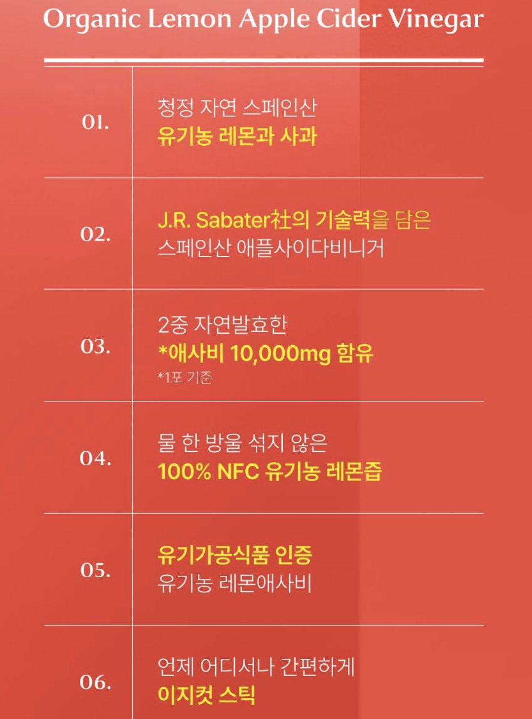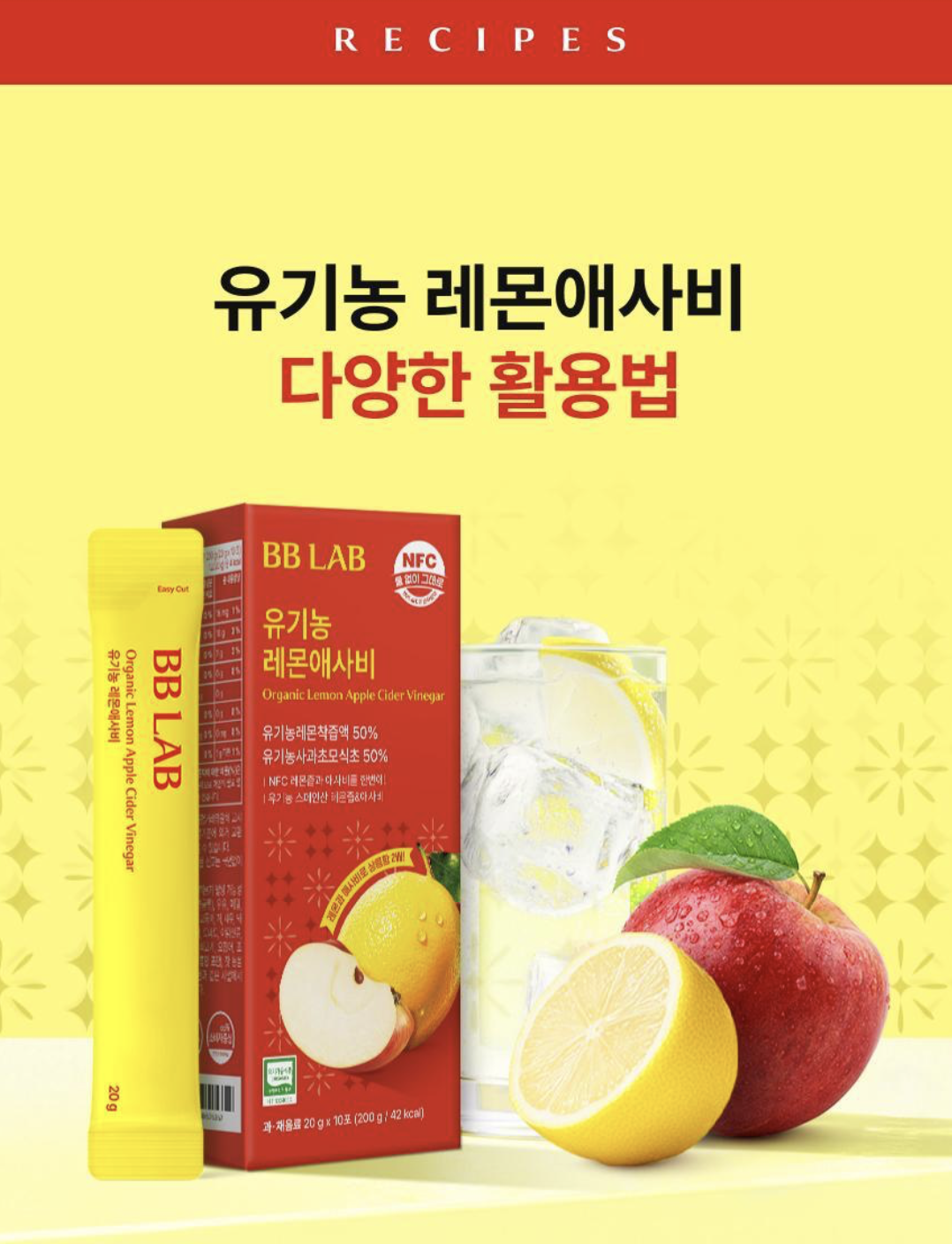 將“有機蘋果醋🍎” + “有機檸檬” 🍋 完美結合濃縮液 唔使再忍受難聞的醋味,酸甜清新,幫你餐後消滯、阻斷脂肪吸收👙💖 ✨ 輕鬆飲出輕盈體態,好氣色🌸 #香港女生必備的健康飲品~ ‣ 有機蘋果醋 (ACV) x 有機檸檬 🍋高濃度維他命 C,抑制黑色素,提亮暗沉膚色 🍎蘋果醋含有豐富的「醋酸」,有助於餐後血糖穩定、促進代謝 ‣改善腸道健康、去水腫 🚽天然酵素有助於腸道蠕動,幫助排便順暢 🚽對於容易晨起水腫或是長期坐 Office 導致下半身水腫嘅朋友,去水腫效果超明顯 ‣餐後去油膩、阻斷吸收 🙅🏻‍♀️大餐後飲一包,可以幫助消化、去油膩感 🙅🏻‍♀️係香港人最愛火鍋、燒肉後的必備「後悔藥」 幫你維持輕盈體態,告別肚凸凸‼️ 而且BB LAB 採用完美黃金比例調配⚖️ 加入有機檸檬平衡味道,口感清新微酸,好似飲緊檸檬果汁咁舒服~ 排毒美白一 Take 過✔️ 100% 有機認證原料,保證無農藥殘留🌿 採用 NFC (非濃縮還原) 技術,低溫冷壓萃取 完整保留維他命 C 與天然酵素成分💧 ❌無砂糖 ❌無色素 ❌無防腐劑 天然安心,無人工添加👏🏻👏🏻 每包獨立封裝,方便隨身攜帶,隨撕即飲 🚀 無論是在 Office💼 Gym 房還是旅行中 加進礦泉水或氣泡水裡,瞬間變成高級美肌飲品🛒💕 規格:10包 / 盒 產地:韓國