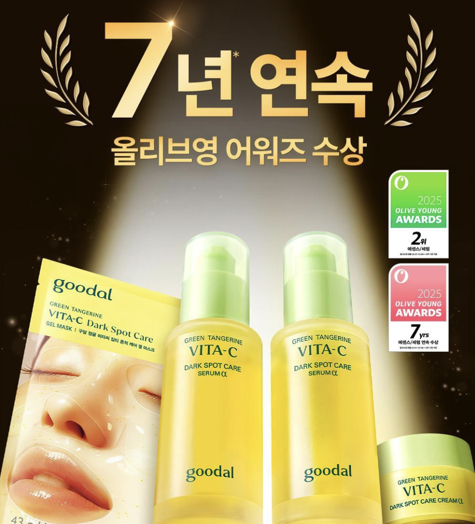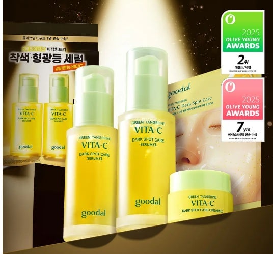 🏆2024 上半年 GlowPick Award #美白精華 第2名 🏆連續5年(2019-2023)榮登Olive Young Awards年度銷量大賞 🏆銷量超過450萬支的皇牌 Goodal Vita C Dark Spot Serum 只需要2星期,有效擊退黑色素、去斑、去痘印 同時亮膚😍 而家仲送10ml 面霜比你試下🎁 ✔️含70%提取自濟州新鮮天然青橘養分 產自濟州島的青橘經過提取之後的維生素C含量比一般橘子多10倍‼️ ✔️7種專利的天然植物舒緩成分,為肌膚注入鮮活能量 ✔️加入維他命B3 迅速為肌膚補充水分 ✔️維他命C + 維他命E 提亮淡斑,有效淡化瑕疵、痘印、雀斑和細紋 ✔️加入積雪草成分,有效舒緩鎮靜肌膚、抑制炎症 質感透明順滑水潤💦 保濕成分瞬間滲透肌膚✨ 採用低敏配方,無添加18種有害成分 ⭕️已通過皮膚刺激測試,適合敏感肌膚使用 不油膩,易推易吸收,所有肌膚適用👏🏻 ➕Goodal Vita C Dark Spot Care Cream 面霜一同使用 美白效果提升達1.4倍😱 📌使用方法 潔面及使用爽膚水後,取適量塗抹於整個臉部,輕輕拍打以幫助吸收 規格:50ml + 50ml (補充裝) + 10ml 面霜(隨機)+面膜1片 產地:韓國