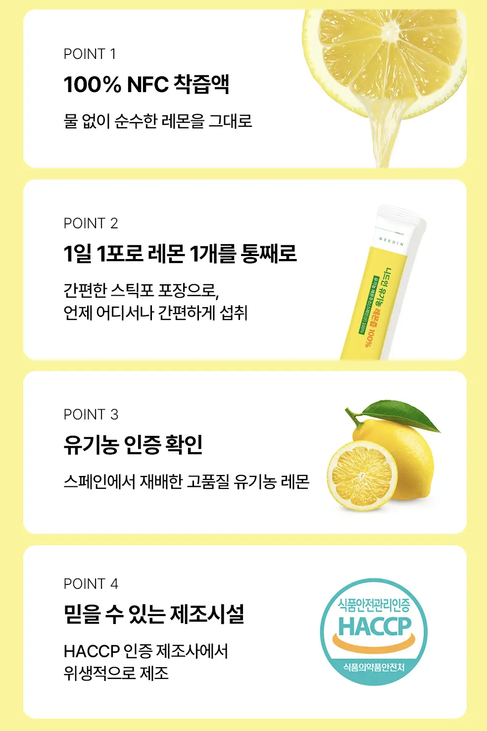 🍋每日一包純有機檸檬汁!健康生活從早晨開始✨🌞 選用西班牙有機檸檬製成🇪🇸 100%純原汁 🌿 無添加、無防腐劑 一包一日份,隨時補充維他命C💛 ✅ 100% NFC非濃縮還原檸檬原汁 ✅ 無糖、無水、無防腐劑,純天然 ✅ 每包20g,獨立包裝,方便攜帶 ✅ 每包僅5.6 kcal,減脂族也安心喝 ✅ 可直接飲用、加水稀釋、搭配蜂蜜或料理使用 📦 一盒14條,兩週份量,早上空腹喝一包,清爽又提神🍋✨ 💬 網友好評:「味道天然不刺喉」、「加在氣泡水裡超好喝」、「比自己榨檸檬方便太多!」🍋🌿🥤 規格:20g / 條 X 14 產地:韓國