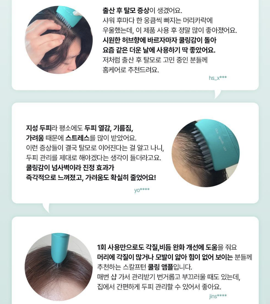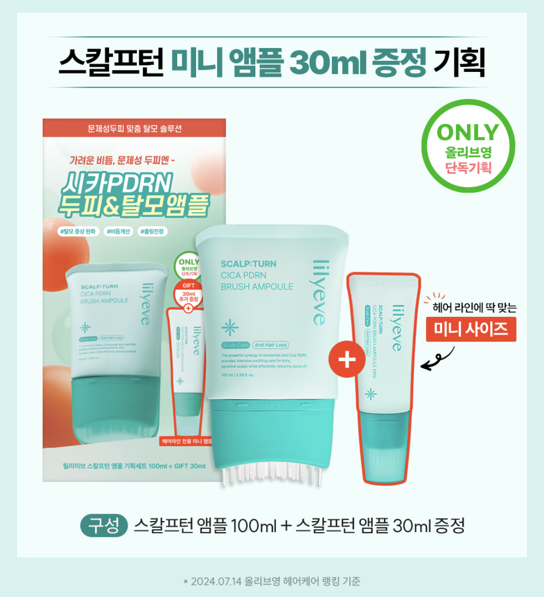 🔥【韓國爆款頭皮安瓶|Lilyeve Scalpturn Cica PDRN】🔥 💆🏻‍♀️ 頭皮保養比臉更重要!這款安瓶精華結合 Cica 穩定修護 × PDRN再生科技,臨床實證有效改善掉髮與頭皮問題,讓你重拾健康髮量 ✨ ▫️ PDRN修護科技:直達毛囊深層,促進細胞再生,強韌髮根 🌿 ▫️ Cica積雪草成分:舒緩敏感、修護頭皮屏障,減少紅腫與不適 💖 ▫️ 專利矽膠刷頭:360°柔珠設計,按摩舒適,零接觸涂抹更衛生 🖌 ▫️ 清爽質地:不黏膩、不油悶,乾濕髮皆可使用,頭皮瞬間透氣 ✨ 📊 臨床數據驗證|使用4週後 • 改善頭皮屑 83% • 頭皮搔癢改善 86% • 頭皮異味減少 88% • 頭皮發燙感降低 11°C 💖 貼心設計 * 360° 矽膠柔珠刷頭,按摩舒適深入毛囊 * 開關式安瓶,控量剛剛好,乾淨又衛生 * 乾濕髮皆可用,輕盈不油膩配方,頭皮透氣超舒服 * 適合日常使用:溫和易吸收,專為敏感頭皮設計 📌 使用方法 洗頭後旋轉開啟刷頭 ,在需要加強處畫Z字涂抹 ,按摩3-5分鐘至吸收 •可直接吹乾,清爽不黏膩 規格:100ml + 30ml 旅行裝 產地:韓國