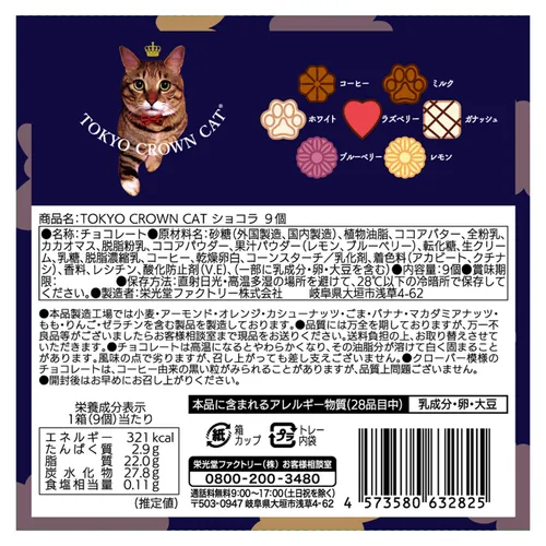 日本人氣糖果品牌 Tokyo Crown Cat😸~從包裝到甜食,都有佢哋嘅吉祥物國王👑「Mr.Torakich」陪伴,真係 味覺 + 視覺雙重享受💕! 呢款 情人節限定朱古力禮盒💝,外型精美,入面仲有多款口味,送禮自用都一樣啱!無論係情人節禮物、送比朋友,定係自己偷偷享受,都係一份 甜蜜心意🤩🥳。 😋內容物 (9顆裝) 1. 咖啡朱古力x 1 2. 牛奶朱古力x 2 3. 檸檬朱古力x 1 4. 白朱古力x 2 5. 莓果朱古力x 1 6. 藍莓朱古力x 1 7. 牛奶甘那許朱古力x 1 🎁容量:9入 🔺尺寸: 12.5×12.3×2.8cm 🎌產地:日本 😋賞味期限: 自製造日起6個月內 ⏳ 📍保存方法: 避免陽光直射、高溫潮濕的地方,並存放在 28°C 以下的陰涼避光處。