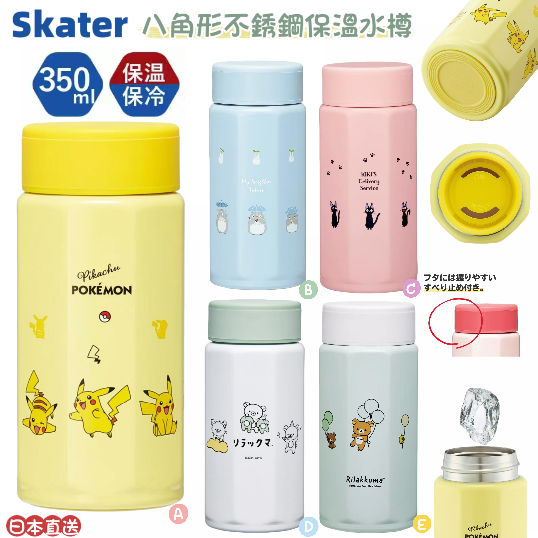 🧊 保冷 🔥 保溫|雙吸嘴設計,夠晒方便! 🔸 八角形樽身,手感好唔易滾 🔸 不鏽鋼真空雙層結構,保溫保冷力強 🔸 杯蓋防滑設計,握得穩又舒服 ⚠️ 小貼士: ・唔好放入洗碗機/烘乾機 ・熱飲要等凍啲先飲,小心燙傷! 🎨 款式選擇: ⚡ Pokemon 🌿 龍貓 Totoro 🧹 魔女宅急便 🐻 輕鬆熊基本款 🎈 輕鬆熊氣球款 📏 尺寸:直徑 69mm x 高 152mm 🫗 容量:350ml 🌡 保溫:63°C 或以上(6 小時) ❄️ 保冷:9°C 或以下(6 小時) 📦 產地:中國(🇯🇵日本直送,品質保證!) 📌更多其他 Skater 產品:https://ondayhk.com/products?q=skater&cat=all