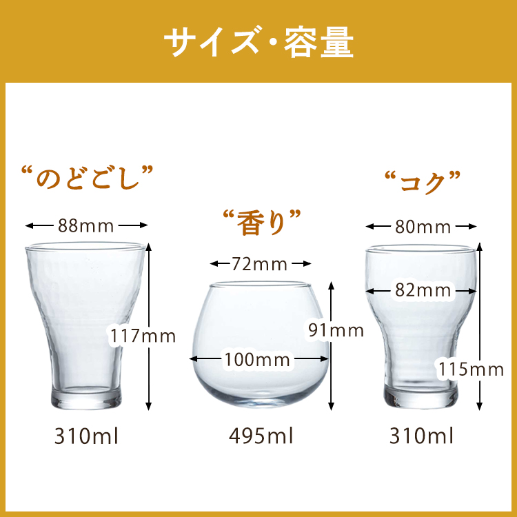 🛫[預購] - 貨品會在確認付款後約7-12日到貨 「享受香氣」、「享受醇厚」、「享受暢飲」的三件套裝。 三種酒杯凸顯精釀啤酒的個性,可以按照自己喜歡的方式享用啤酒。 ✨寬口形:享受清爽暢飲的飲用體驗,「享受暢飲」的啤酒杯。 ✨圓形: 將精釀啤酒獨特的香氣保留在杯中,「享受香氣」的啤酒杯。 ✨低形狀:包裹著啤酒氣泡和醇厚,「享受濃鬱口感」的啤酒杯。 包裝內附有簡單易懂的產品特性及精釀啤酒說明。 盒子上面有一個引人注目的解釋插圖,亦建議作為禮物。 🎈可用家用洗碗機清洗 ▪️尺寸|(左): 直径8.7×高11.7cm / (中): 直径7.3×高9cm / (右): 直径8×高11.5cm ▪️容量|310ml、495ml、310ml ▪️重量|220g、149g、215g ▪️材質|鈉鈣玻璃 📍產地|日本