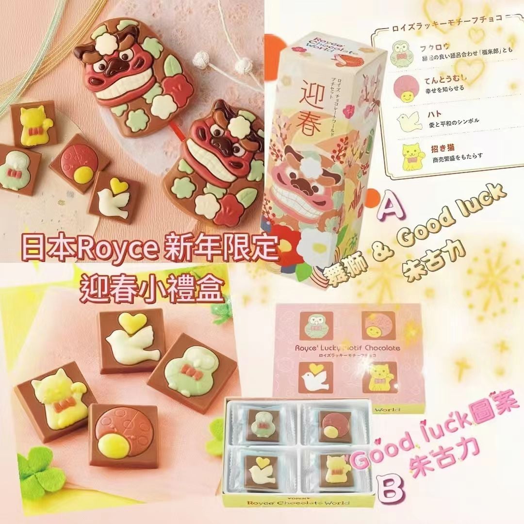 日本直送 Royce 新年限定朱古力,包括超有氣氛嘅 [舞獅]🤩 牛奶朱古力同埋印有 幸運圖案🕊️朱古力,寓意滿滿好運,非常適合送禮或自用,齊齊迎新春🧧! 🍫 [舞獅]朱古力:醇厚香滑牛奶朱古力,甜而不膩,口感一流😋 🍫 幸運圖案朱古力:印有四款象徵好運嘅圖案,送禮超有心思! 🦉 貓頭鷹:「福袋」諧音,寓意吉祥 🐞 瓢蟲:傳遞幸福 🕊️ 鴿子:愛與和平 🐱 招財貓:招財進寶 💝A. 舞獅 & 吉祥圖案朱古力 (10入) 😋內容:2 種 / 共 10 件 Royce Pop Chocolate [舞獅] x 2,幸運圖案巧克力 x 8 🎁包裝尺寸: 長 5.4 x 寬 5.4 x 高 16.5cm ❤️B. 吉祥圖案朱古力 (12入) 😋內容:共12件 幸運圖案巧克力 x 12 🎁包裝尺寸: 長 10 x 寬 13.3 x 高 2.5cm 📍產地:日本 🍫保存方法: 避免陽光直射、高溫和潮濕,並在 25°C 以下儲存。 😋 賞味期限: 製造日起3個月(將在45 - 60天或以上交貨,包括發貨日期。) ⚠️注意: ▪️所有ROYCE朱古力產品均使用空運到港。 如產品在運送中而導致熔化,將不能安排退換。 📌更多其他 ROYCE 產品: https://ondayhk.com/c/%E7%AF%80%E6%85%B6%E7%A6%AE%E5%93%81/ROYCE'%20%E5%B0%88%E5%8D%80