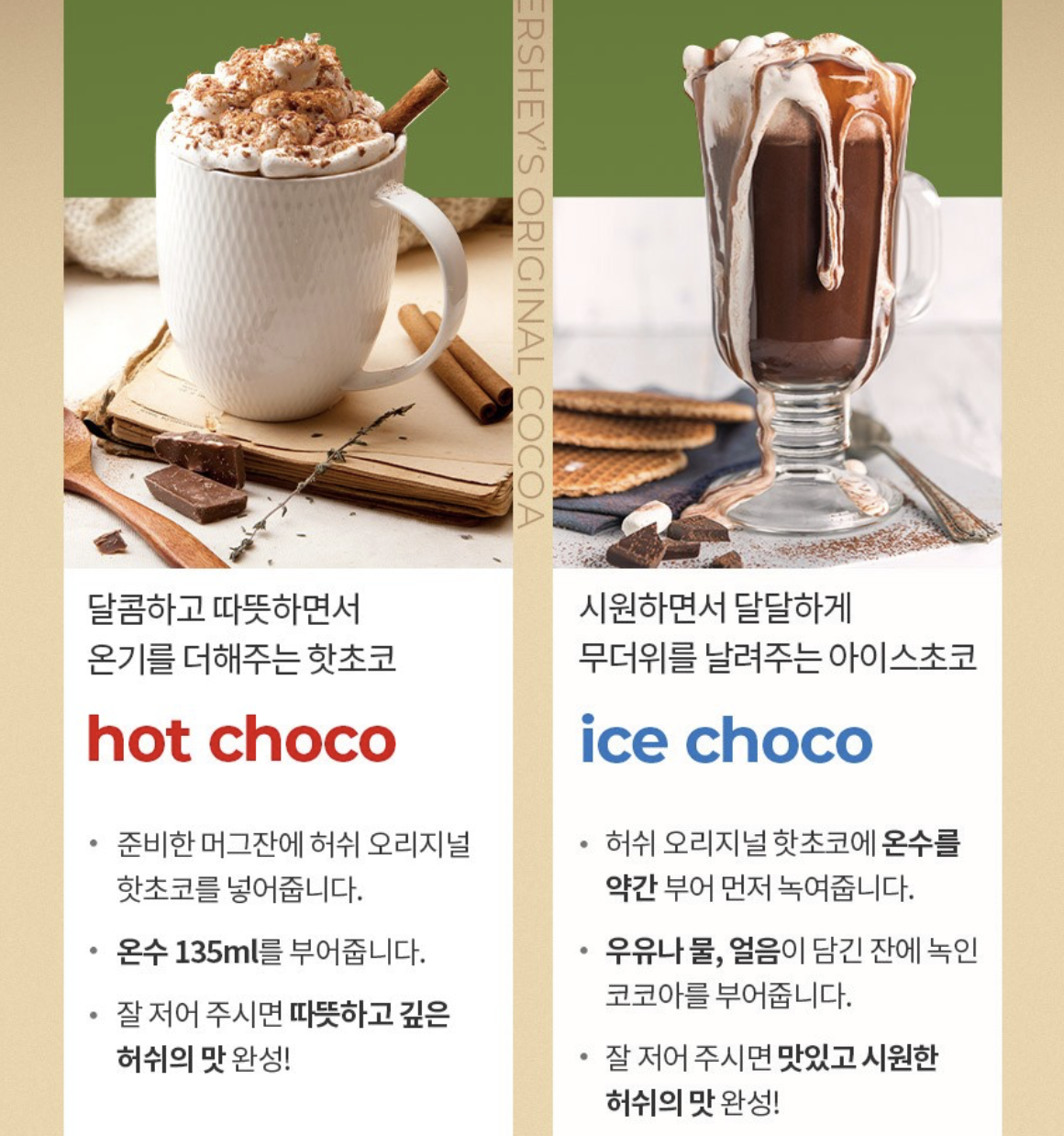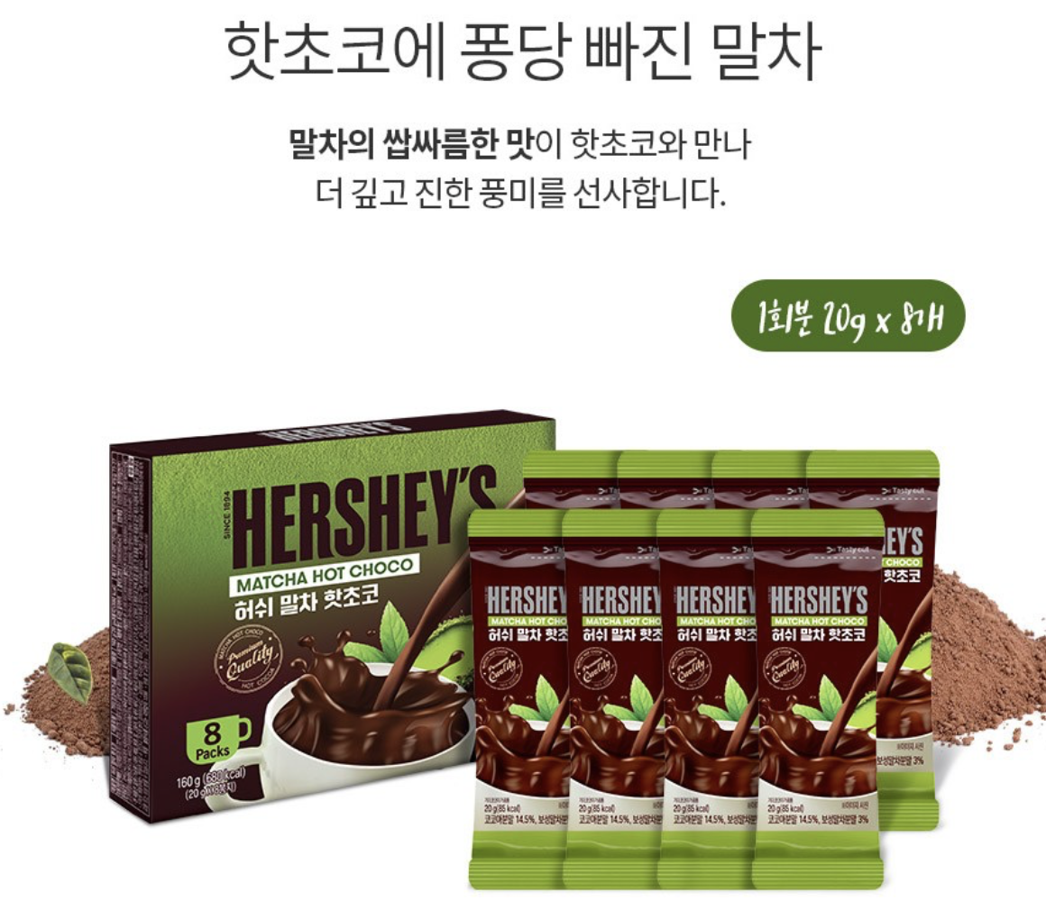 🍵【HERSHEY’S 抹茶熱可可|韓國限定版冬季暖心飲品】✨ #抹茶控注意‼️ 濃郁抹茶+香濃可可,一口暖入心💚 將經典 HERSHEY’S 濃郁可可🍫 完美結合清新回甘嘅上等抹茶🍵 味道平衡得啱啱好,層次豐富 創造出令人無法抗拒嘅「抹茶熱可可」 絕對會令抹茶控尖叫💚 雙重享受 😋: 一次過滿足朱古力同抹茶兩個願望!口感順滑、香氣濃郁 冬日恩物 ☕: 喺凍冰冰嘅日子,沖返杯暖笠笠,即刻由頭暖到落腳,療癒感滿分 方便沖調 💧: 獨立包裝,無論喺屋企、Office 定係 宿舍、露營, 加水或加熱牛奶🥛就搞掂,隨時享受 Cafe 級享受 人氣熱賣 🔥: 韓國/台灣SNS已經瘋傳緊,快啲跟上熱潮試下啦~ 🇰🇷 韓國限定版包裝,送禮自用都夠特別 🛒 立即入手 HERSHEY’S 抹茶熱可可,讓你一口暖入心,甜入心扉 規格:8包 / 盒 產地:韓國 📌 香港抹茶飲品推薦|韓國熱可可|冬季暖心飲品|即沖飲品|Hershey’s熱可可|抹茶控必試|韓國飲品推薦|辦公室沖泡飲品|宵夜甜品搭配