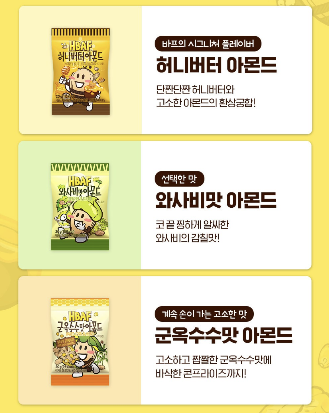 一次滿足你的味蕾~ 一包集齊 3 種超人氣口味,滿足晒你嘅好奇心 派對分享定係自己食都超方便💖 🍯蜂蜜牛油杏仁: 經典必食,甜甜鹹鹹好上癮 甜甜奶油香+淡淡蜂蜜味,溫和不膩口,第一次買最安全款 🍯🧈 🌽烤粟米杏仁: 充滿粟米香氣,鹹香帶甜,越吃越順口 🌵芥末杏仁 :微辣刺激一入口就醒腦,越食越過癮,重口味派一定會愛 🌶️ 杏仁富含維他命E、膳食纖維同優質脂肪🌰👍 係健康又美味的零食選擇,食得開心又無罪惡感🤤 多樣口味搭配🌈讓每一口都充滿新鮮感 每款口味5包,不論是派對聚會、下午茶分享 或小朋友零食 還是節日送禮,都能瞬間提升氛圍🎉 🛒 立即入手讓派對更歡樂、更甜蜜 規格:15包/ 盒 (每包20g) 產地:韓國