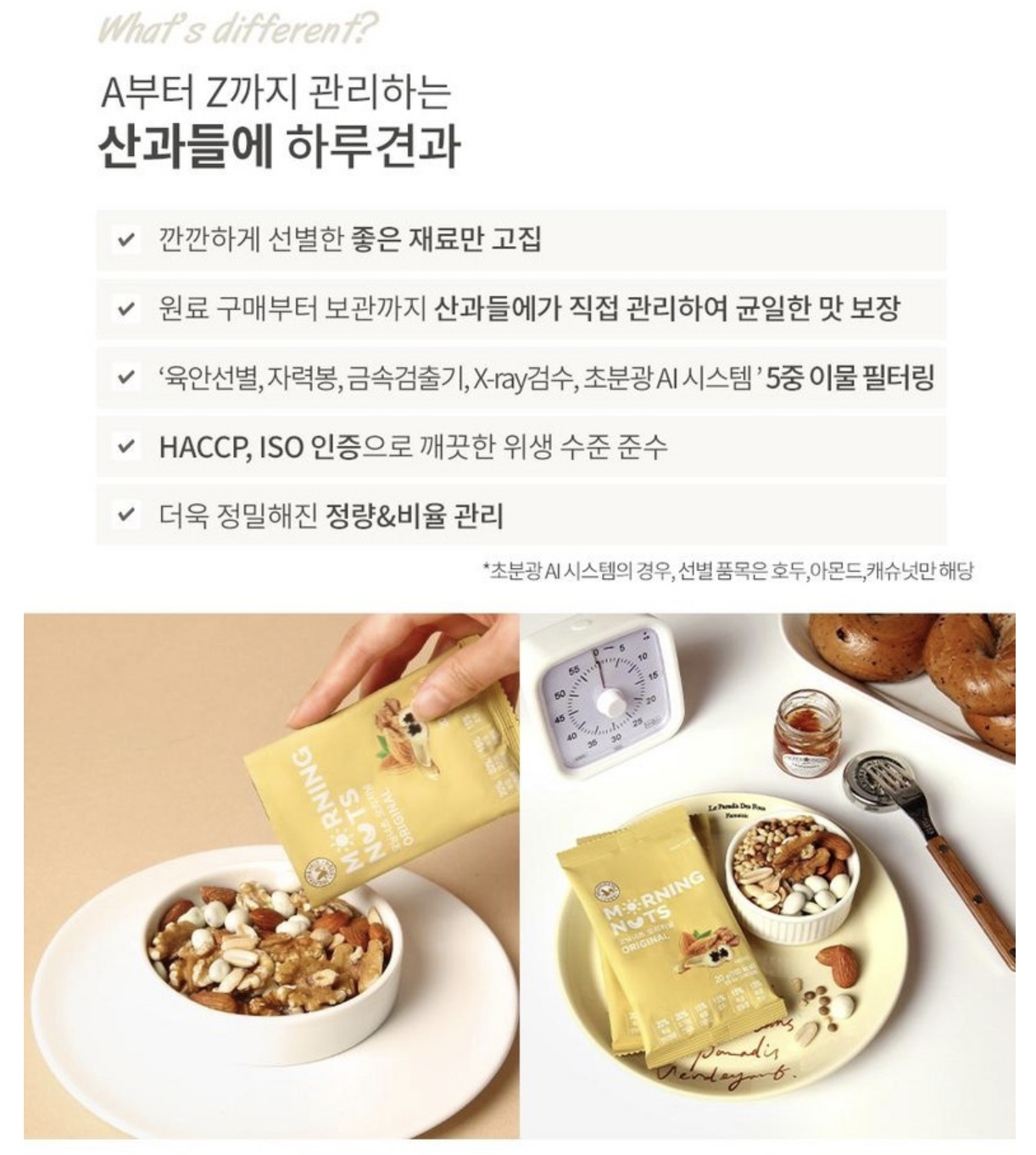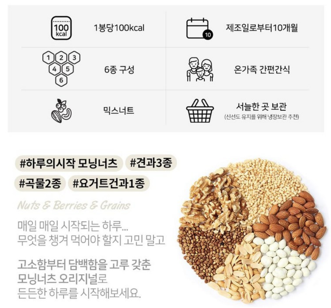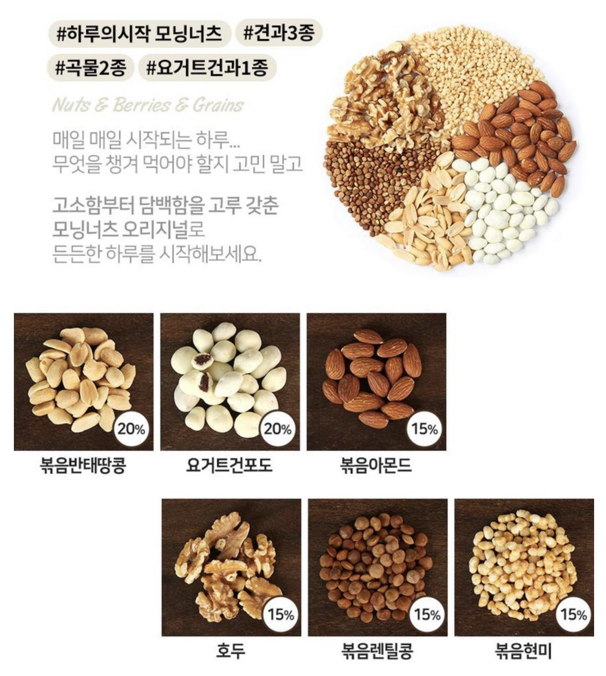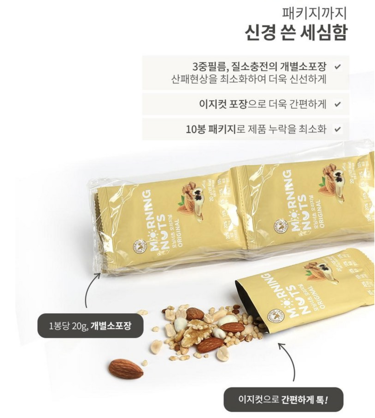 Morning Nuts Original 系列☀️ 專為現代人設計的經典版每日堅果包 每包僅約 100 卡路里,低負擔、高營養 是忙碌生活中的理想能量補充💪 ✅ 低卡配方:比一般每日堅果熱量更低,適合控制飲食或減脂族群 🥜 嚴選6種原料:花生、杏仁、核桃、優格葡萄乾、扁豆、糙米,營養均衡 🍒 無添加糖與人工香料:保留食材原味,吃得安心又健康 📦 獨立包裝設計:每包 20g,攜帶方便,隨時補充能量 🕒 適合多種時機:早餐搭配優格、下午茶點心、運動後補充、上班族提神 ✨炒花生 20% ✨優格葡萄乾 20% ✨烤杏仁 15% ✨核桃 15% ✨炒扁豆 15% ✨炒糙米 15% 6 種原料組合均衡⚖️ 兼具蛋白質、膳食纖維與健康脂肪,適合日常補充營養 特別適合想吃得健康又不想攝取過多熱量的你💮 規格:30包 (每包20g) 產地:韓國
