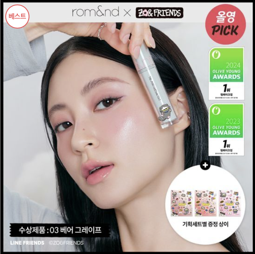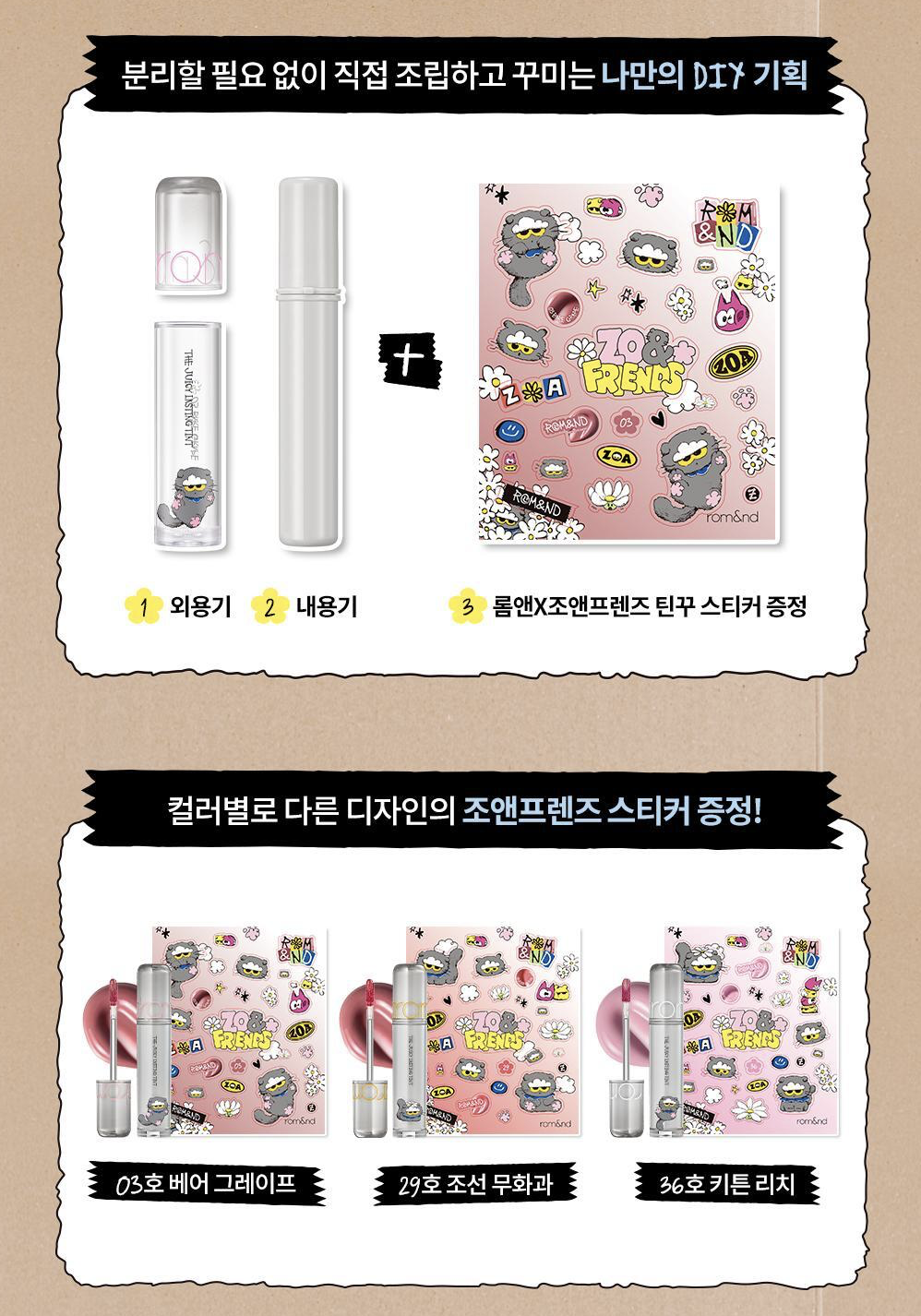 Romand x Zo&Friends 可愛聯名登場🐈‍⬛✨ 由人氣品牌Rom&nd 與 GD 的愛貓「조아」為靈感,設計感十足 #Oliveyoung限定 #GD迷不能錯過 #收藏控必收 💄THE JUICY LASTING TINT💄 不只唇彩色澤美到爆💥色澤飽滿、水潤持久 包裝可愛又能自由DIY,讓唇彩不只是彩妝,更是個人風格的展現✨ Rom&nd 經典「Juicy Lasting Tint」系列 🍇主打水潤光澤感,塗抹後呈現自然果汁唇效果 💫持久顯色不黏膩,即使喝水也不容易掉色,適合日常通勤或約會妝容 💋質地輕盈滑順,不會厚重或卡唇紋,乾唇也能安心使用 🎨 DIY客製化包裝:每支唇釉附贈角色貼紙,貼紙設計療癒可愛 可自由裝飾唇管,打造獨一無二的唇彩外觀😍 📌三款人氣色號,合亞洲膚色與冷暖膚調 ‣ 03 Bear Grape:柔霧葡萄紫,顯白又有氣質 ‣ 29 Joseon Fig:韓式無花果裸粉,溫柔日常感 ‣ 36 Kitten Lychee:貓咪玫瑰棕,成熟又不失甜美 規格:3.5g / 支 產地:韓國