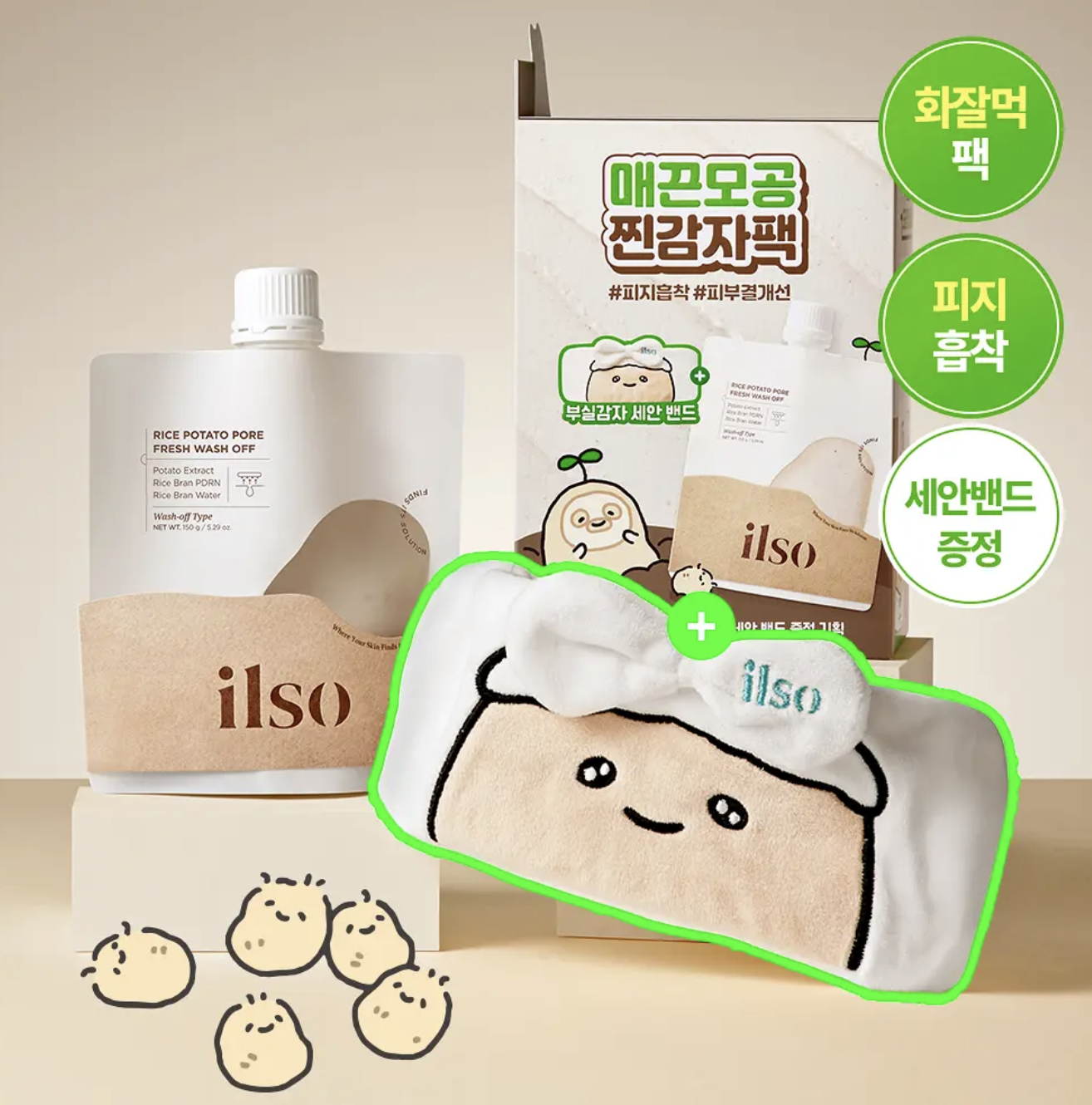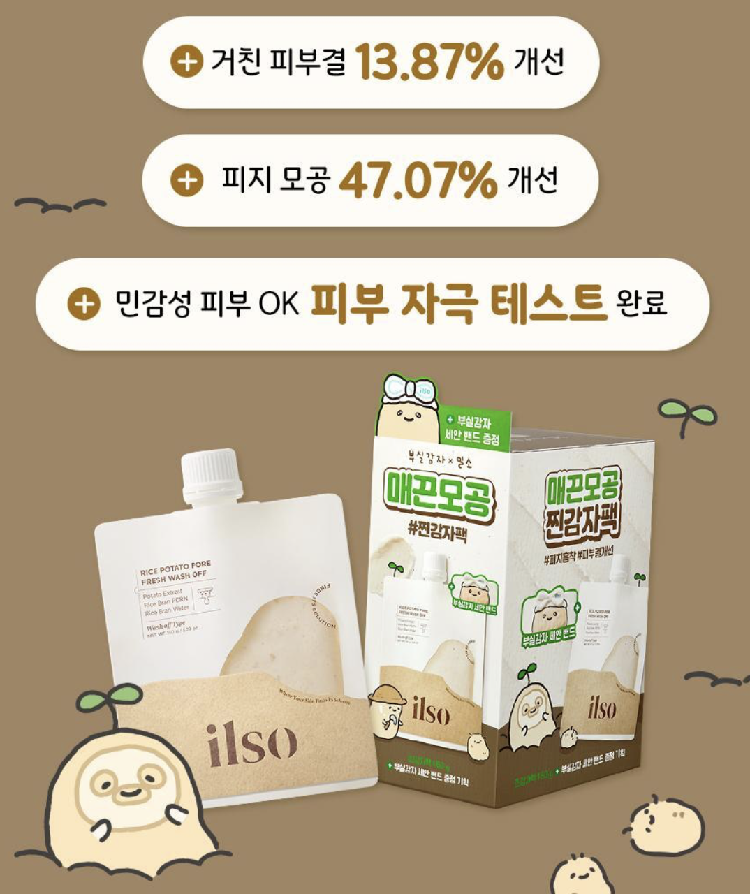 ilso 聯乘超人氣 IP “不實馬鈴薯 (부실감자)推出超萌限定套裝🥔🌟 毛孔清爽洗淨新體驗 ✨ 幫你一次過吸走油垢、代謝角質、提亮膚色!💖 🥔 馬鈴薯萃取物:具有美白舒緩功效,潔淨同時提亮暗沉膚色,減少乾燥與刺激 🍚 米萃取物:溫和淨化毛孔,改善粗糙,讓肌膚更細緻 🧼 Wash-Off 面膜設計:馬鈴薯泥能緊密貼合肌膚,厚敷 5–10 分鐘,深層吸附黑頭、白頭、油脂與污垢,洗後肌膚清爽不緊繃 ❄️ 冰涼舒緩:質地濕潤順滑,敷嘅過程帶有陣陣清涼感 🔬實驗數據顯示,單次使用後 ‣ 粗燥膚質改善 13.87%